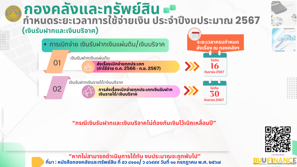 ด้วยขณะนี้ใกล้สิ้นปีงบประมาณ พ.ศ. 2567 และเพื่อให้การเบิกจ่ายเงินเป็นไปตามกำหนดระยะเวลาและมีประสิทธิภาพ กองคลังและทรัพย์สิน เห็นควรให้มีการเร่งรัดการเบิกจ่ายเงิน กำหนดระยะเวลาการเบิกจ่ายเงินงบประมาณรายจ่าย และการโอนเปลี่ยนแปลงงบประมาณรายจ่าย ประจำปีงบประมาณ พ.ศ. 2567 ซึ่งมีรายละเอียดดัง เอกสารแนบ
